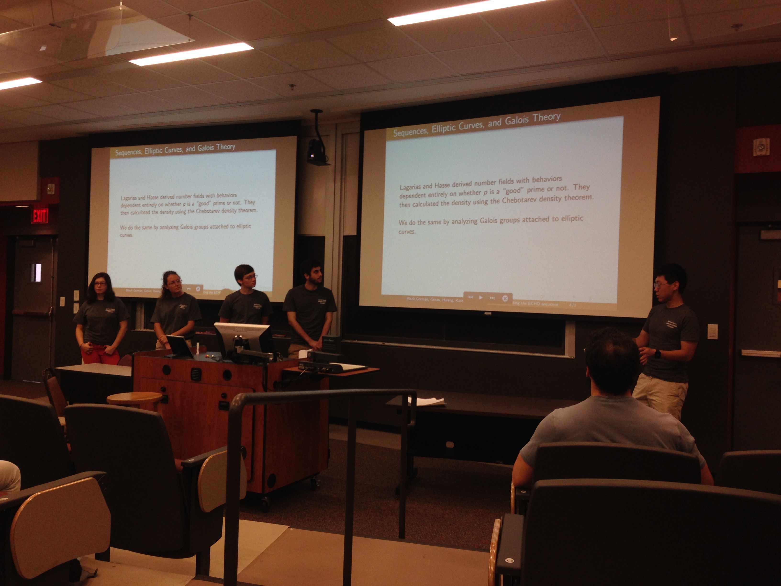 • Primes dividing the ECHO sequence” (Block Gorman, Genao, Hwang, Kantor, Parsons), Mock AMS Conference, University of Georgia, July 2015. Also, given at the AMS-MAA-SIAM Special Session on Research in Mathematics by Undergraduates and Students in Post-Baccalaureate Programs, AMS-MAA Joint Meetings, Saturday, January 9, 2016.
