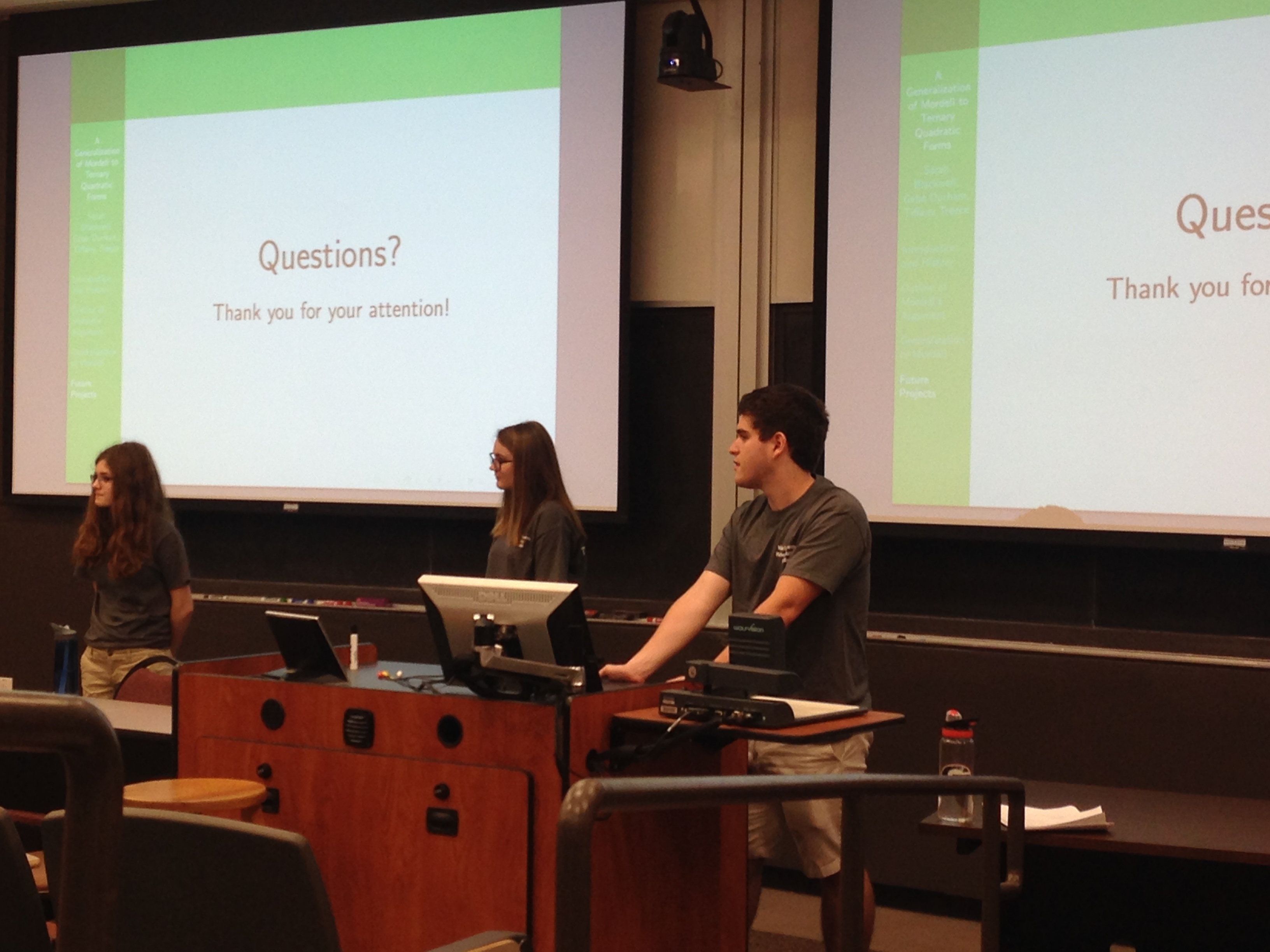 • A generalization of Mordell to ternary quadratic forms” (Blackwell, Durham, Treece), Mock AMS Conference, University of Georgia, July 2015. Also, given at the AMS-MAA-SIAM Special Session on Research in Mathematics by Undergraduates and Students in Post-Baccalaureate Programs, AMS-MAA Joint Meetings, Saturday, January 9, 2016.